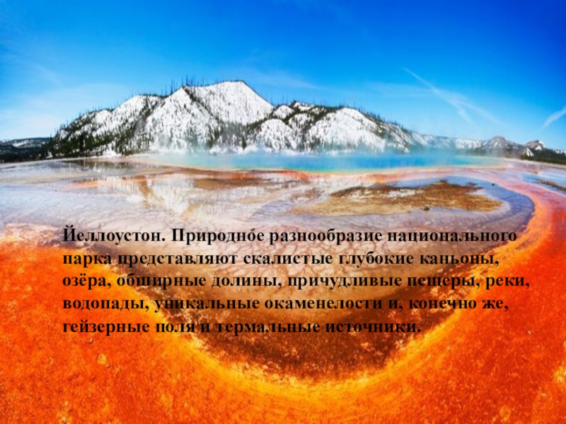 Слайд 20Йеллоустон. Природное разнообразие национального парка представляют скалистые глубокие каньоны, озёра, обширные
