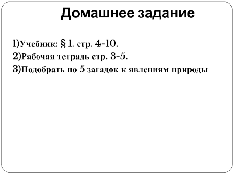 Домашнее задание1)Учебник: § 1. стр. 4-10.2)Рабочая тетрадь стр. 3-5.3)Подобрать по 5 загадок к явлениям природы