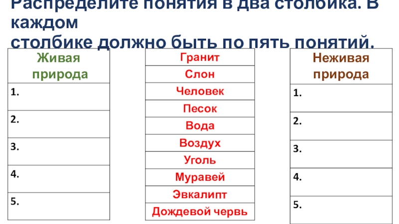Слайд 12Распределите понятия в два столбика. В каждом столбике должно быть по пять