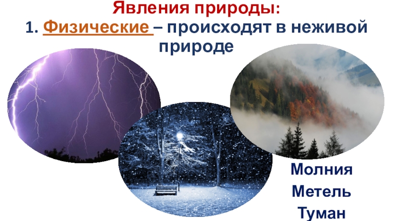 Явления природы: 1. Физические – происходят в неживой природеМолнияМетельТуман