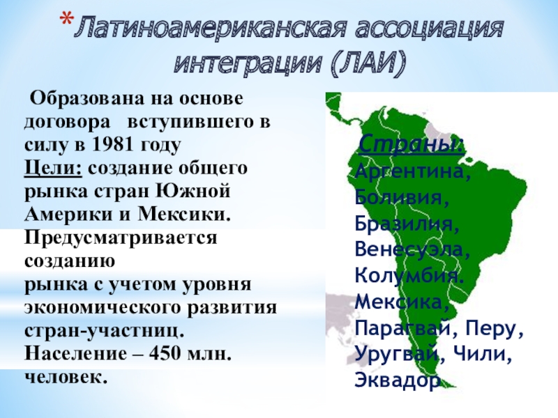 Цели: создание общего рынка стран Южной Америки и Мексики. Предусматривается