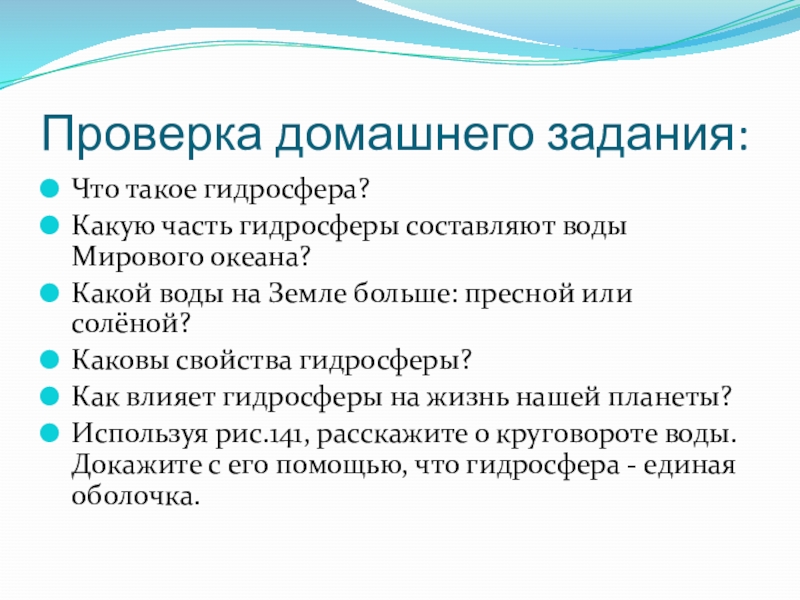 Проверка домашнего задания:Что такое гидросфера?Какую часть гидросферы составляют воды Мирового океана?Какой воды на Земле больше: пресной или солёной?Каковы свойства гидросферы?Как влияет гидросферы на жизнь нашей планеты?Используя рис.141, расскажите о круговороте воды. Докажите с его помощью, что
