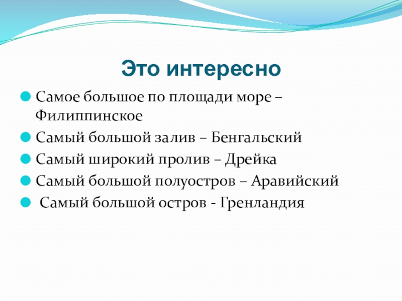Это интересноСамое большое по площади море – ФилиппинскоеСамый большой залив – БенгальскийСамый широкий пролив – ДрейкаСамый большой