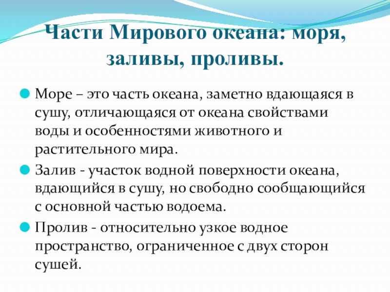 Части Мирового океана: моря, заливы, проливы.  Море – это часть океана, заметно вдающаяся в сушу, отличающаяся от