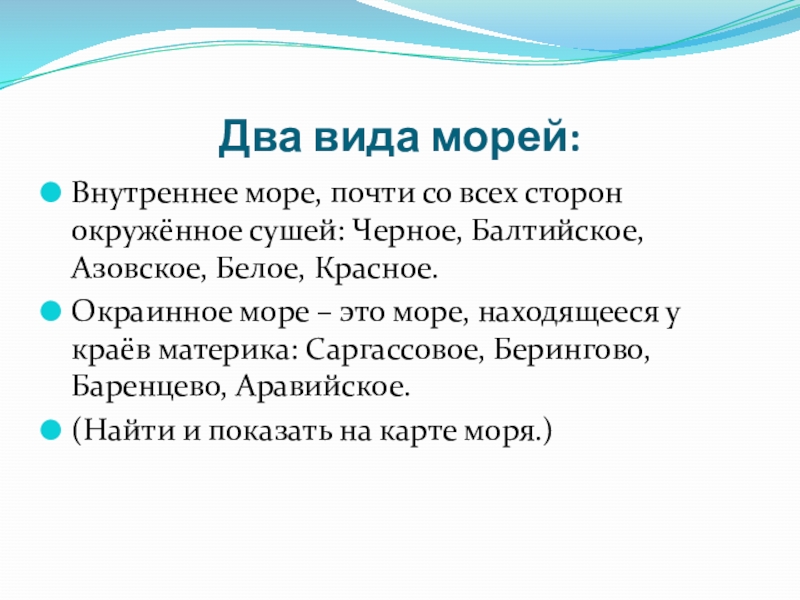 Два вида морей:Внутреннее море, почти со всех сторон окружённое сушей: Черное, Балтийское, Азовское, Белое, Красное.Окраинное море –