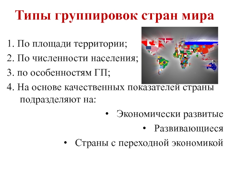 Типы группировок стран мира1. По площади территории;2. По численности населения;3. по особенностям ГП;4. На основе качественных показателей