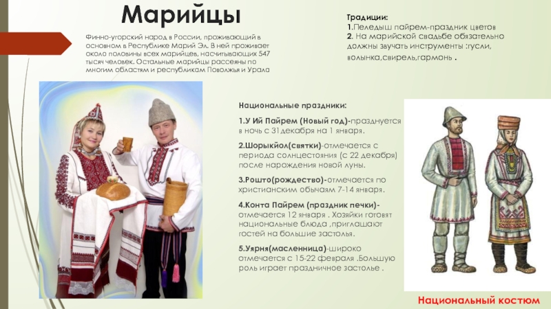 Финно-угорский народ в России, проживающий в основном в Республике Марий Эл. В ней проживает около половины всех марийцев, насчитывающих 547 тысяч человек. Остальные марийцы рассеяны по многим областям и республикам Поволжья и Урала
