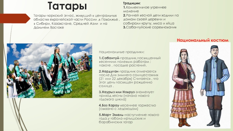 Татары-тюркский этнос, живущий в центральных областях европейской части России ,в Поволжье ,в Сибири, Казахстане, Средней Азии и на Дальнем Востоке