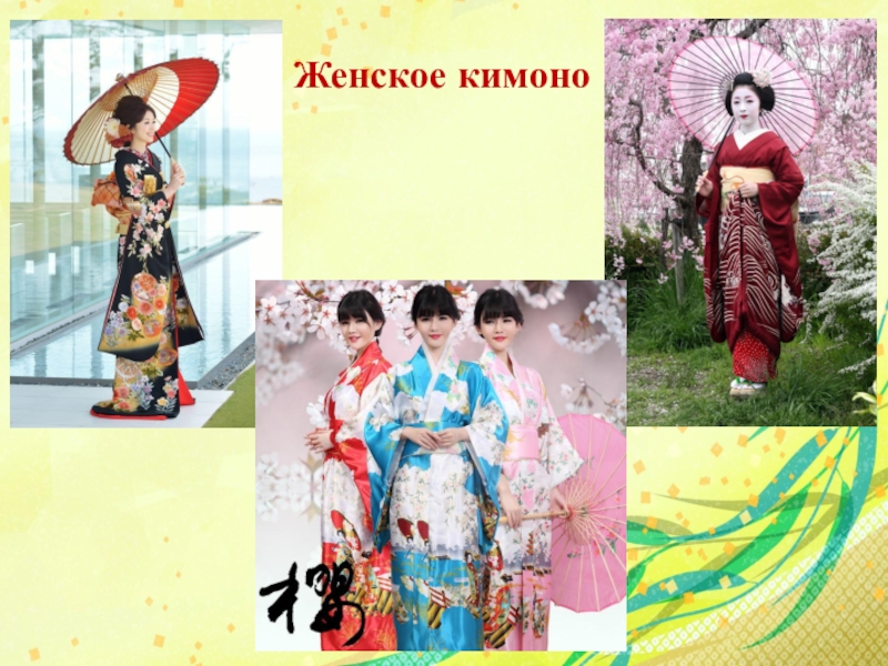 Кимоно – одежда, которая никогда не выбрасывается. Непременным атрибутом женского туалета являются: шпилька для украшения волос, веер, зонтик.