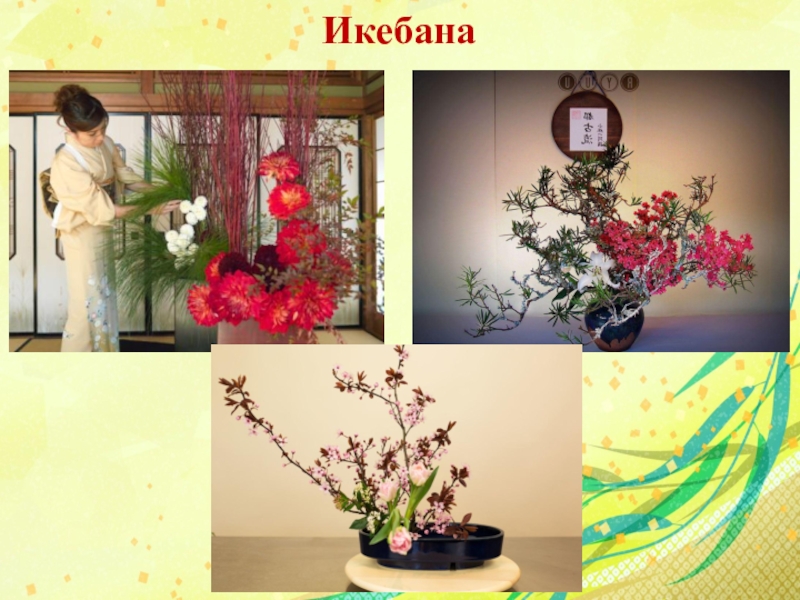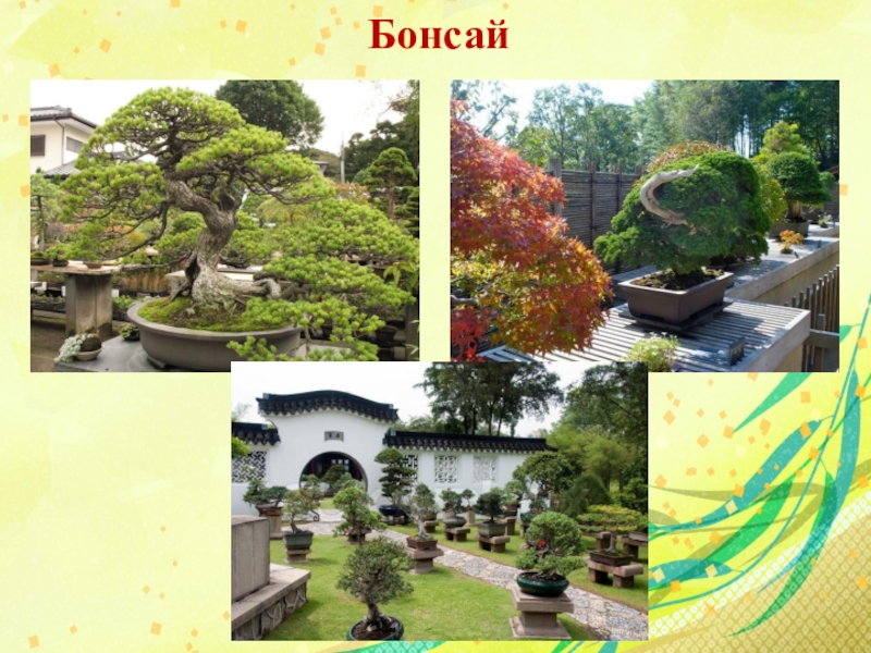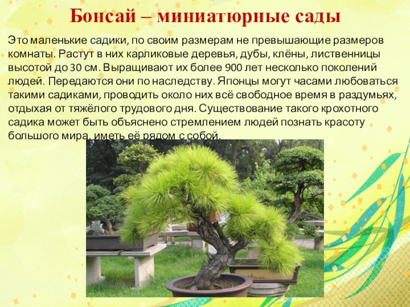 размеров комнаты. Растут в них карликовые деревья, дубы, клёны, лиственницы высотой до 30 см. Выращивают их более 900 лет несколько поколений людей. Передаются они по наследству. Японцы могут часами любоваться такими садиками, проводить около них всё свободное время в раздумьях, отдыхая от тяжёлого трудового дня. Существование такого крохотного садика может быть объяснено стремлением людей познать красоту большого мира, иметь её рядом с собой.