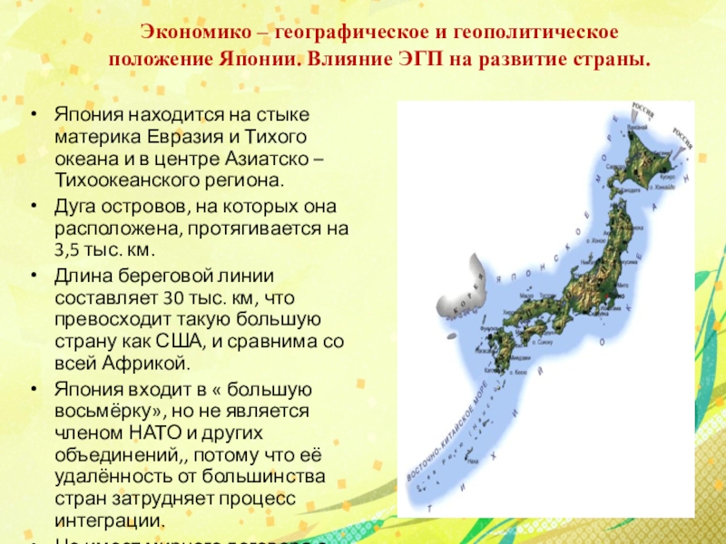 Слайд 6Экономико – географическое и геополитическое положение Японии. Влияние ЭГП на развитие