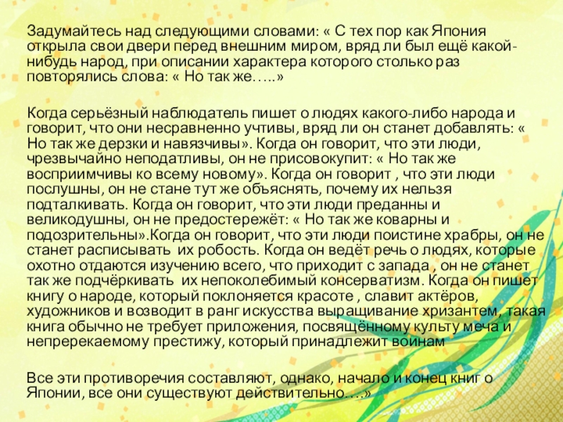 как Япония открыла свои двери перед внешним миром, вряд ли был ещё какой-нибудь народ, при описании характера которого столько раз повторялись слова: « Но так же…..»