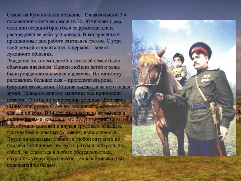 Слайд 24Семьи на Кубани были большие . Глава большой 3-4 поколенной казачьей