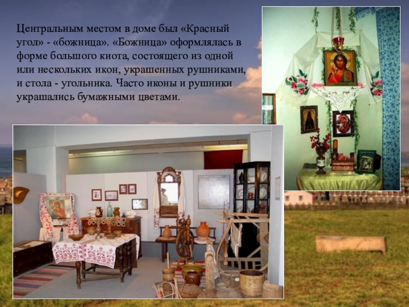Слайд 17Центральным местом в доме был «Красный угол» - «божница». «Божница» оформлялась