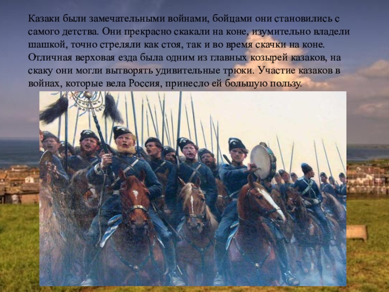 Слайд 8Казаки были замечательными войнами, бойцами они становились с самого детства. Они
