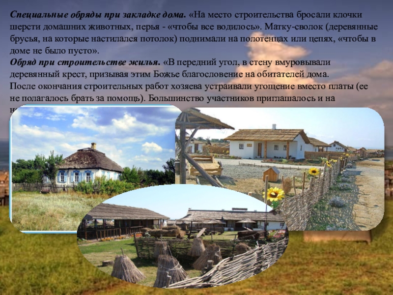 Слайд 15Специальные обряды при закладке дома. «На место строительства бросали клочки шерсти домашних