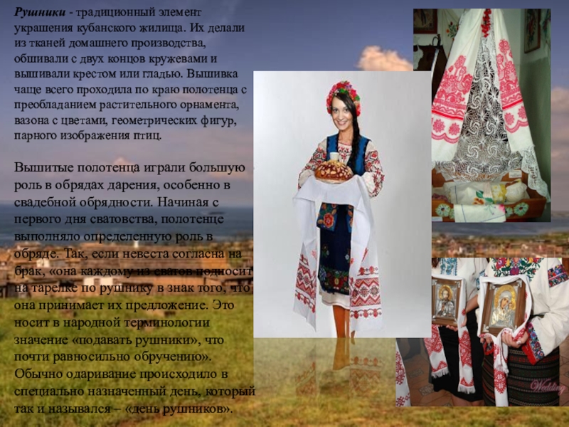 Слайд 18Рушники - традиционный элемент украшения кубанского жилища. Их делали из тканей домашнего