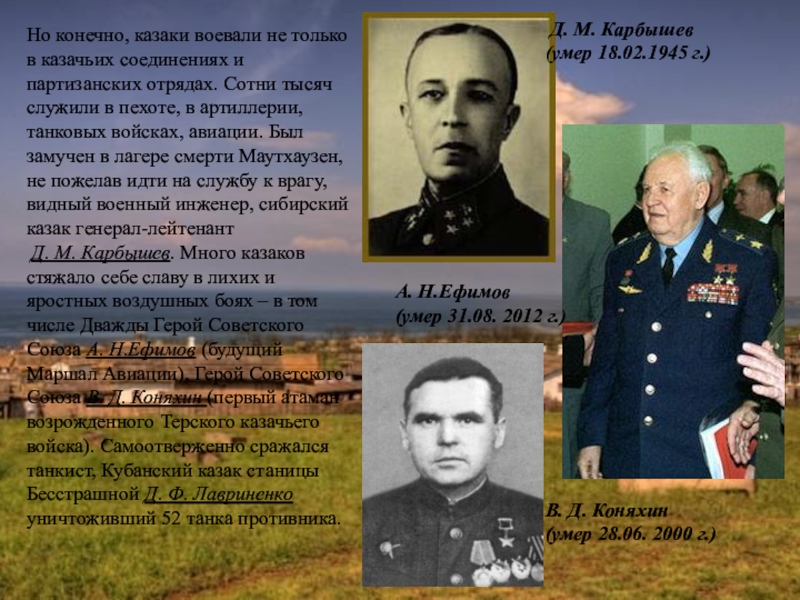 Д. М. Карбышев. Много казаков стяжало себе славу в лихих и яростных воздушных боях – в том числе Дважды Герой Советского Союза А. Н.Ефимов (будущий Маршал Авиации), Герой Советского Союза В. Д. Коняхин (первый атаман возрожденного Терского казачьего войска). Самоотверженно сражался танкист, Кубанский казак станицы Бесстрашной Д. Ф. Лавриненко уничтоживший 52 танка противника.