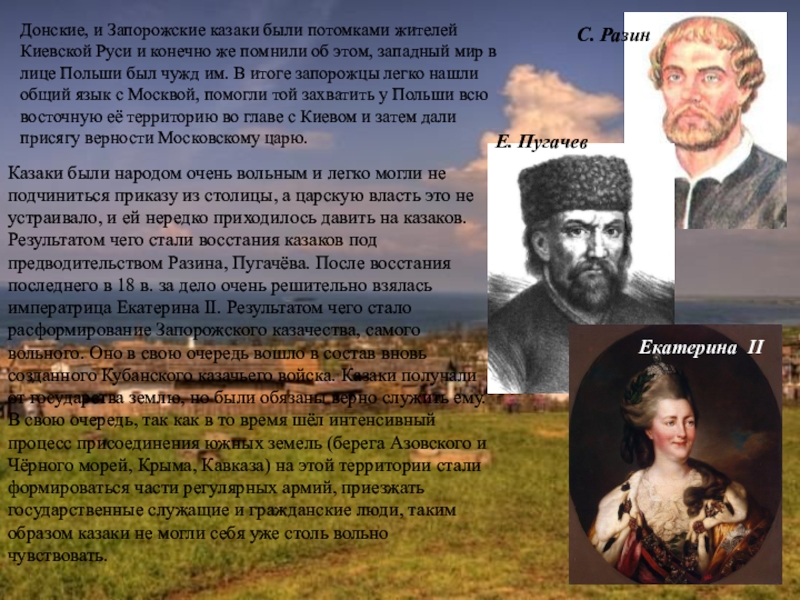 Казаки были народом очень вольным и легко могли не подчиниться приказу из столицы, а царскую власть это не устраивало, и ей нередко приходилось давить на казаков. Результатом чего стали восстания казаков под предводительством Разина, Пугачёва. После восстания последнего в 18 в. за дело очень решительно взялась императрица Екатерина II. Результатом чего стало расформирование Запорожского казачества, самого вольного. Оно в свою очередь вошло в состав вновь созданного Кубанского казачьего войска. Казаки получали от государства землю, но были обязаны верно служить ему. В свою очередь, так как в то время шёл интенсивный процесс присоединения южных земель (берега Азовского и Чёрного морей, Крыма, Кавказа) на этой территории стали формироваться части регулярных армий, приезжать государственные служащие и гражданские люди, таким образом казаки не могли себя уже столь вольно чувствовать.