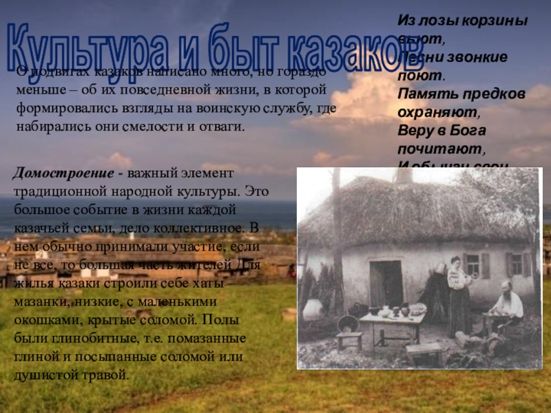 Домостроение - важный элемент традиционной народной культуры. Это большое событие в жизни каждой казачьей семьи, дело коллективное. В нем обычно принимали участие, если не все, то большая часть жителей Для жилья казаки строили себе хаты – мазанки, низкие, с маленькими окошками, крытые соломой. Полы были глинобитные, т.е. помазанные глиной и посыпанные соломой или душистой травой.