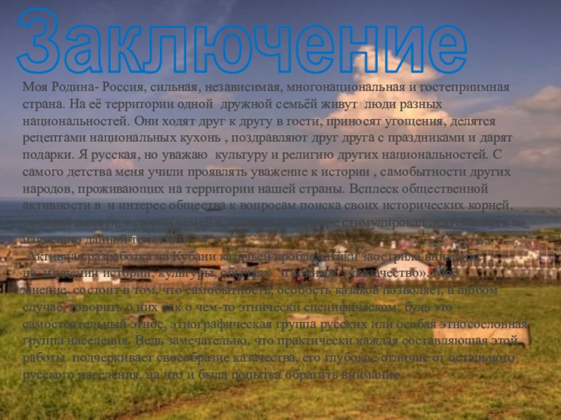 территории одной дружной семьёй живут люди разных национальностей. Они ходят друг к другу в гости, приносят угощения, делятся рецептами национальных кухонь , поздравляют друг друга с праздниками и дарят подарки. Я русская, но уважаю культуру и религию других национальностей. С самого детства меня учили проявлять уважение к истории , самобытности других народов, проживающих на территории нашей страны. Всплеск общественной активности в и интерес общества к вопросам поиска своих исторических корней, родовой памяти, истории семей в значительной мере стимулировал деятельность по изучению данной тематики.
