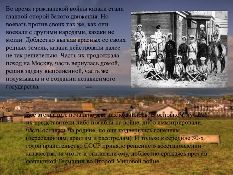 Слайд 11Во время гражданской войны казаки стали главной опорой белого движения. Но