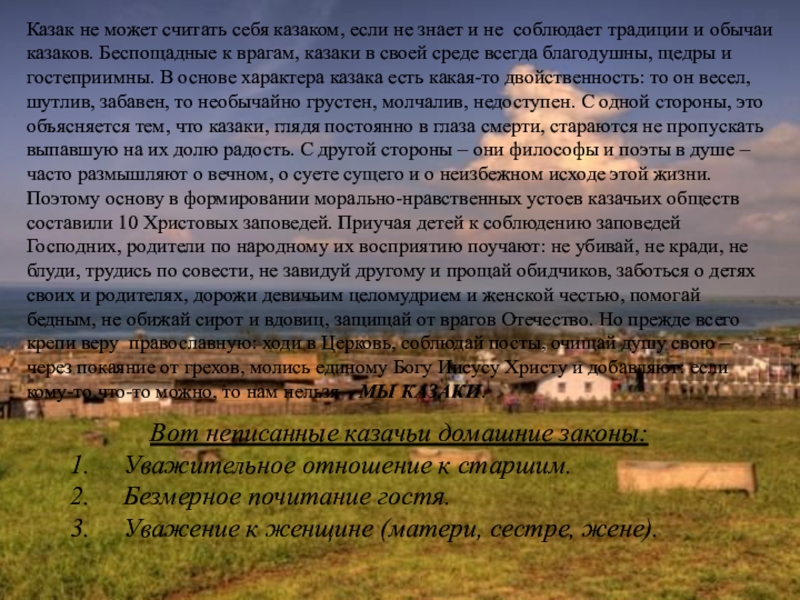 традиции и обычаи казаков. Беспощадные к врагам, казаки в своей среде всегда благодушны, щедры и гостеприимны. В основе характера казака есть какая-то двойственность: то он весел, шутлив, забавен, то необычайно грустен, молчалив, недоступен. С одной стороны, это объясняется тем, что казаки, глядя постоянно в глаза смерти, стараются не пропускать выпавшую на их долю радость. С другой стороны – они философы и поэты в душе – часто размышляют о вечном, о суете сущего и о неизбежном исходе этой жизни. Поэтому основу в формировании морально-нравственных устоев казачьих обществ составили 10 Христовых заповедей. Приучая детей к соблюдению заповедей Господних, родители по народному их восприятию поучают: не убивай, не кради, не блуди, трудись по совести, не завидуй другому и прощай обидчиков, заботься о детях своих и родителях, дорожи девичьим целомудрием и женской честью, помогай бедным, не обижай сирот и вдовиц, защищай от врагов Отечество. Но прежде всего крепи веру православную: ходи в Церковь, соблюдай посты, очищай душу свою – через покаяние от грехов, молись единому Богу Иисусу Христу и добавляют: если кому-то что-то можно, то нам нельзя – МЫ КАЗАКИ.