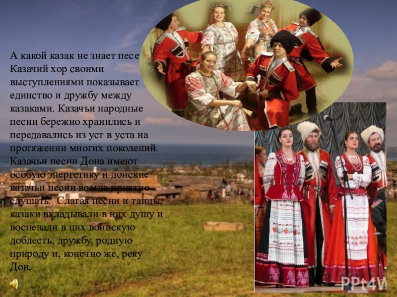единство и дружбу между казаками. Казачьи народные песни бережно хранились и передавались из уст в уста на протяжении многих поколений. Казачьи песни Дона имеют особую энергетику и донские казачьи песни всегда приятно слушать. Слагая песни и танцы, казаки вкладывали в них душу и воспевали в них воинскую доблесть, дружбу, родную природу и, конечно же, реку Дон.