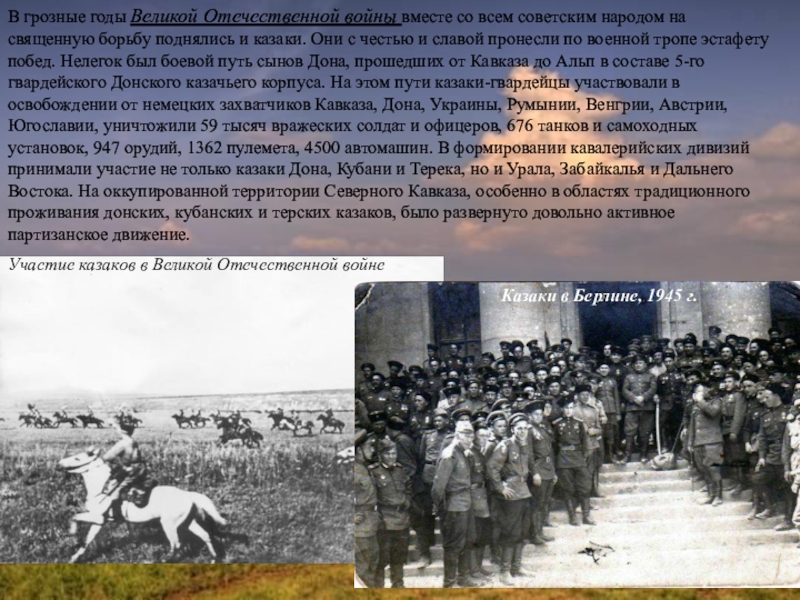 на священную борьбу поднялись и казаки. Они с честью и славой пронесли по военной тропе эстафету побед. Нелегок был боевой путь сынов Дона, прошедших от Кавказа до Альп в составе 5-го гвардейского Донского казачьего корпуса. На этом пути казаки-гвардейцы участвовали в освобождении от немецких захватчиков Кавказа, Дона, Украины, Румынии, Венгрии, Австрии, Югославии, уничтожили 59 тысяч вражеских солдат и офицеров, 676 танков и самоходных установок, 947 орудий, 1362 пулемета, 4500 автомашин. В формировании кавалерийских дивизий принимали участие не только казаки Дона, Кубани и Терека, но и Урала, Забайкалья и Дальнего Востока. На оккупированной территории Северного Кавказа, особенно в областях традиционного проживания донских, кубанских и терских казаков, было развернуто довольно активное партизанское движение.