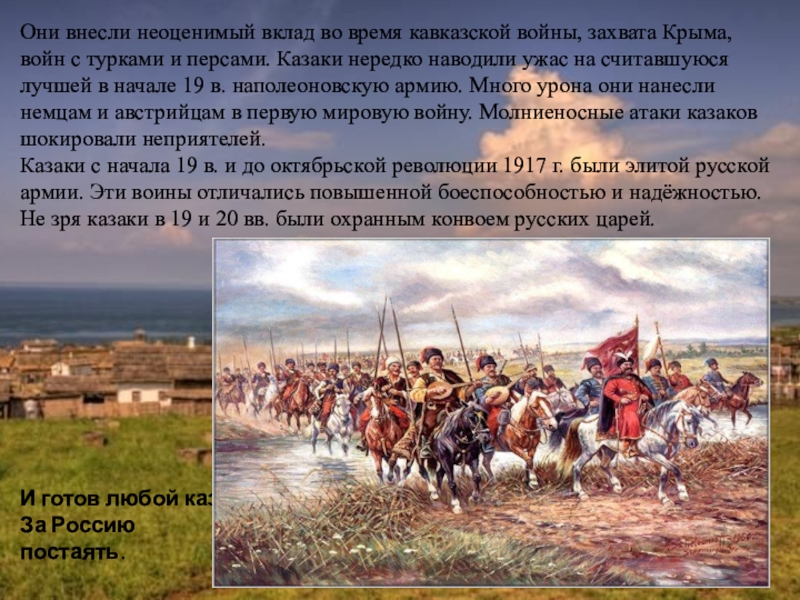 кавказской войны, захвата Крыма, войн с турками и персами. Казаки нередко наводили ужас на считавшуюся лучшей в начале 19 в. наполеоновскую армию. Много урона они нанесли немцам и австрийцам в первую мировую войну. Молниеносные атаки казаков шокировали неприятелей.