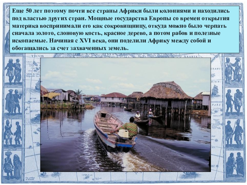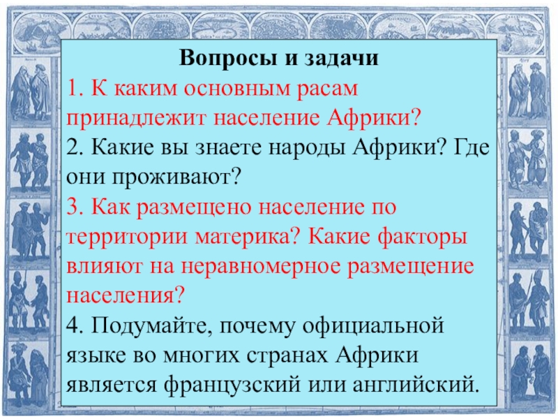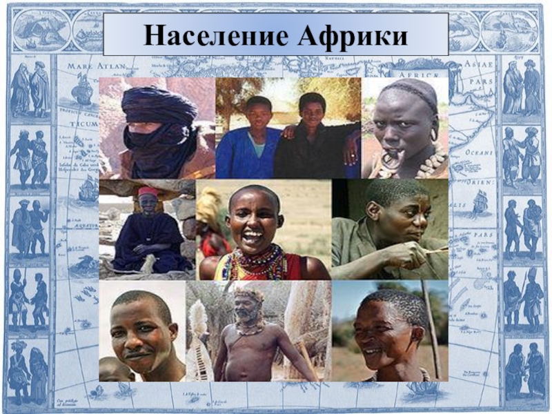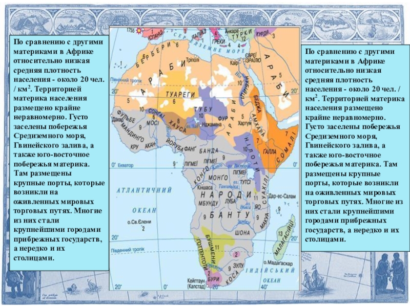 По сравнению с другими материками в Африке относительно низкая средняя плотность населения - около 20 чел. / км2. Территорией материка населения размещено крайне неравномерно. Густо заселены побережья Средиземного моря, Гвинейского залива, а также юго-восточное побережья материка. Там размещены крупные порты, которые возникли на оживленных мировых торговых путях. Многие из них стали крупнейшими городами прибрежных государств, а нередко и их столицами.