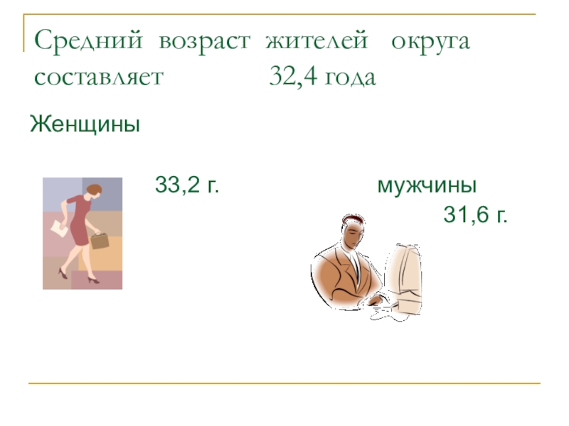 Средний возраст жителей  округа  составляет       32,4 годаЖенщины