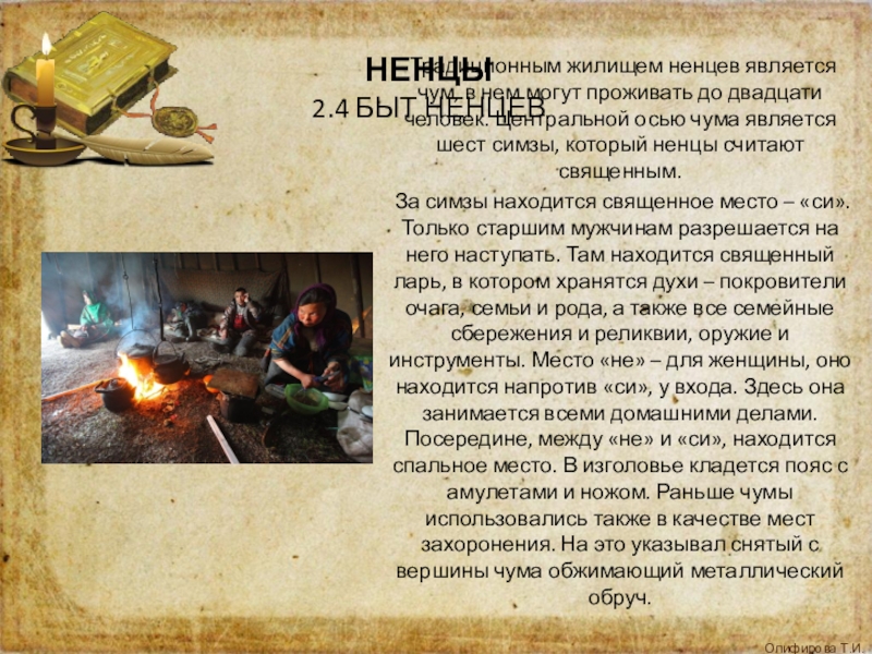 могут проживать до двадцати человек. Центральной осью чума является шест симзы, который ненцы считают священным.