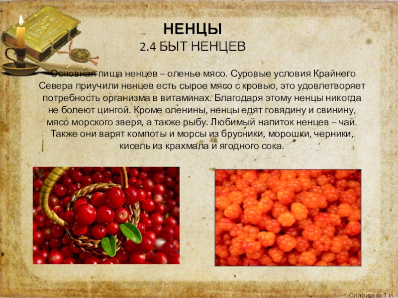 условия Крайнего Севера приучили ненцев есть сырое мясо с кровью, это удовлетворяет потребность организма в витаминах. Благодаря этому ненцы никогда не болеют цингой. Кроме оленины, ненцы едят говядину и свинину, мясо морского зверя, а также рыбу. Любимый напиток ненцев – чай. Также они варят компоты и морсы из брусники, морошки, черники, кисель из крахмала и ягодного сока.