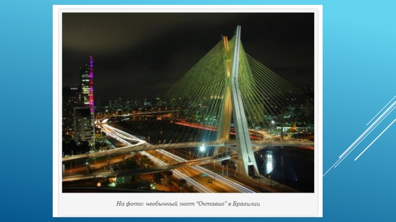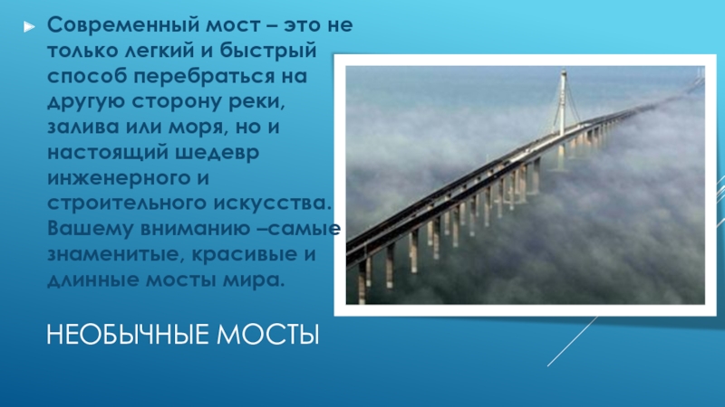 перебраться на другую сторону реки, залива или моря, но и настоящий шедевр инженерного и строительного искусства. Вашему вниманию –самые знаменитые, красивые и длинные мосты мира.
