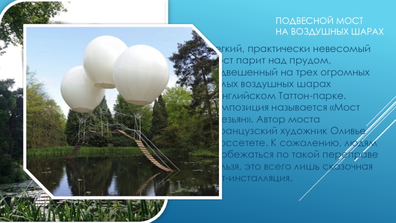 на трех огромных белых воздушных шарах в английском Таттон-парке. Композиция называется «Мост обезьян». Автор моста французский художник Оливье Гроссетете. К сожалению, людям пробежаться по такой переправе нельзя, это всего лишь сказочная арт-инсталляция.