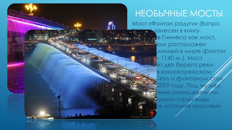 мост, на котором расположен самый длинный в мире фонтан (длина — 1140 м ). Мост соединяет два берега реки Ханшуй в южнокорейском городе Сеул и фонтаном стал только в 2009 году. Под музыку, освещенные разноцветными светодиодами струи воды двигаются, исполняя красивый танец.