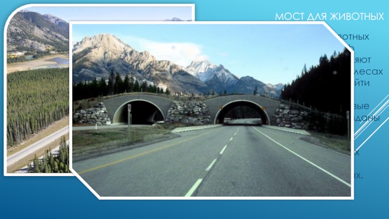 мосты позволяют диким животным, живущим в лесах вдоль трасс, безопасно перейти дорогу и не погибнуть под колесами автомобилей. Первые подобные переходы были созданы во Франции в 1950-ых годах. С каждым годом все больше и больше мостов для животных строится в Канаде, США, Нидерландах и других странах.