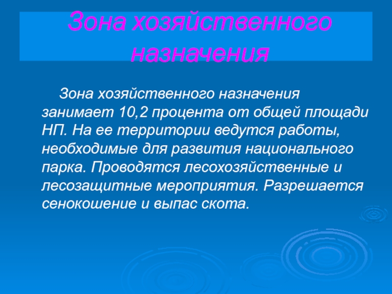 общей площади НП. На ее территории ведутся работы, необходимые для развития национального парка. Проводятся лесохозяйственные и лесозащитные мероприятия. Разрешается сенокошение и выпас скота.