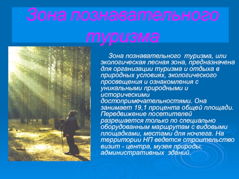 предназначена для организации туризма и отдыха в природных условиях, экологического просвещения и ознакомления с уникальными природными и историческими достопримечательностями. Она занимает 19,1 процента общей площади. Передвижение посетителей разрешается только по специально оборудованным маршрутам с видовыми площадками, местами для ночлега. На территории НП ведется строительство визит - центра, музея природы, административных зданий.