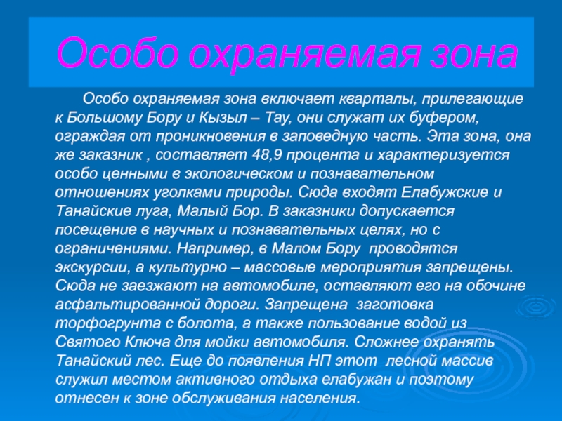 к Большому Бору и Кызыл – Тау, они служат их буфером, ограждая от проникновения в заповедную часть. Эта зона, она же заказник , составляет 48,9 процента и характеризуется особо ценными в экологическом и познавательном отношениях уголками природы. Сюда входят Елабужские и Танайские луга, Малый Бор. В заказники допускается посещение в научных и познавательных целях, но с ограничениями. Например, в Малом Бору проводятся экскурсии, а культурно – массовые мероприятия запрещены. Сюда не заезжают на автомобиле, оставляют его на обочине асфальтированной дороги. Запрещена заготовка торфогрунта с болота, а также пользование водой из Святого Ключа для мойки автомобиля. Сложнее охранять Танайский лес. Еще до появления НП этот лесной массив служил местом активного отдыха елабужан и поэтому отнесен к зоне обслуживания населения.