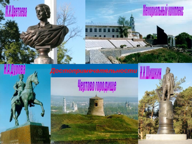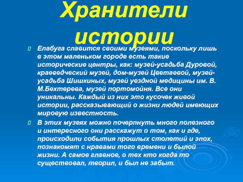 есть такие исторические центры, как: музей-усадьба Дуровой, краеведческий музей, дом-музей Цветаевой, музей-усадьба Шишкиных, музей уездной медицины им. В.М.Бехтерева, музей портомойня. Все они уникальны. Каждый из них это кусочек живой истории, рассказывающий о жизни людей имеющих мировую известность.