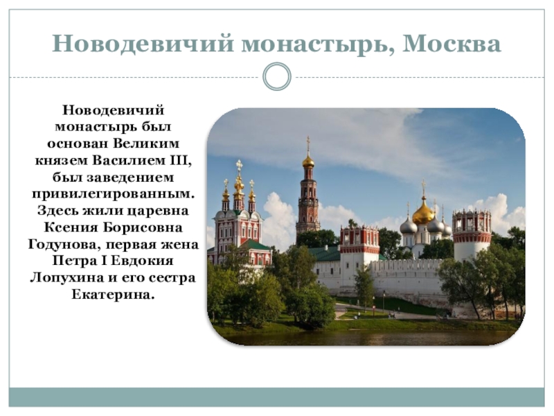 заведением привилегированным. Здесь жили царевна Ксения Борисовна Годунова, первая жена Петра I Евдокия Лопухина и его сестра Екатерина.