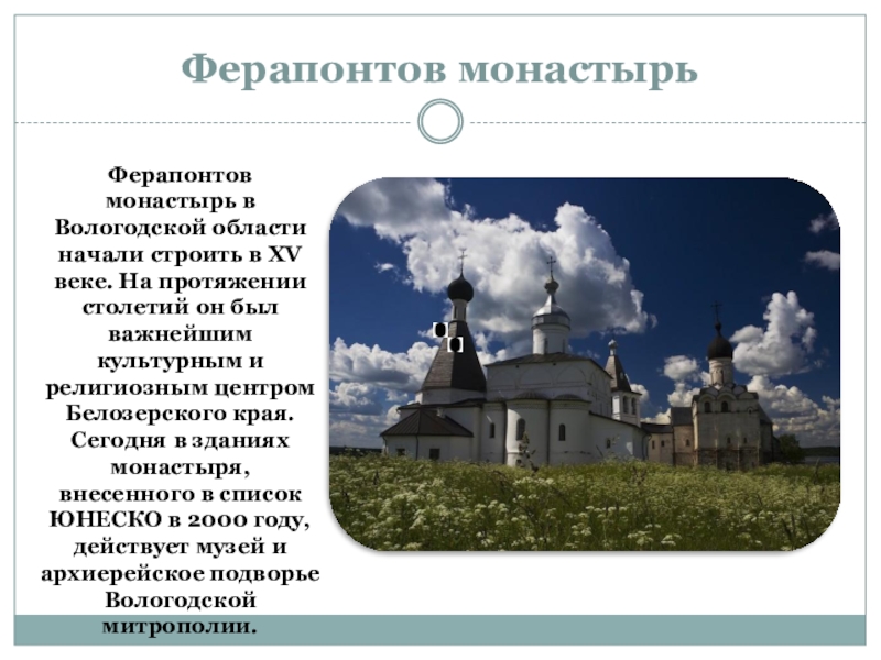 Ферапонтов монастырь в Вологодской области начали строить в XV веке.