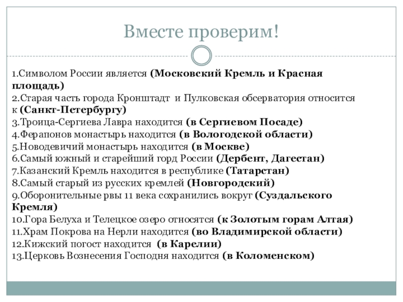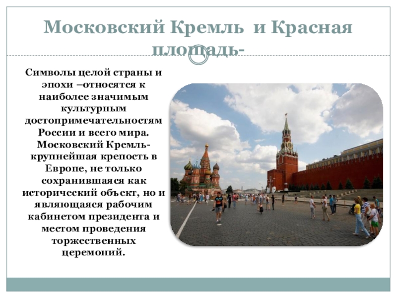 наиболее значимым культурным достопримечательностям России и всего мира. Московский Кремль-крупнейшая крепость в Европе, не только сохранившаяся как исторический объект, но и являющаяся рабочим кабинетом президента и местом проведения торжественных церемоний.