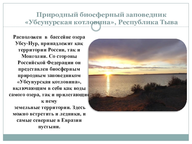 Слайд 21Природный биосферный заповедник «Убсунурская котловина», Республика Тыва