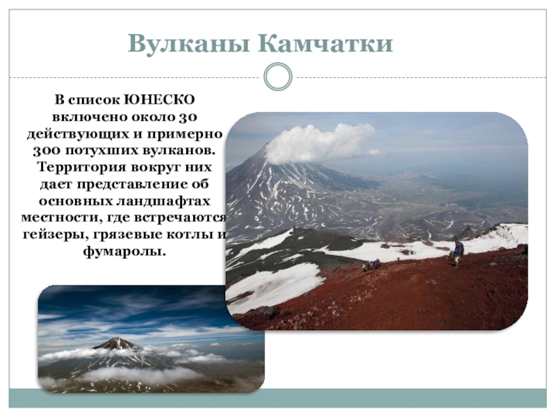 потухших вулканов. Территория вокруг них дает представление об основных ландшафтах местности, где встречаются гейзеры, грязевые котлы и фумаролы.