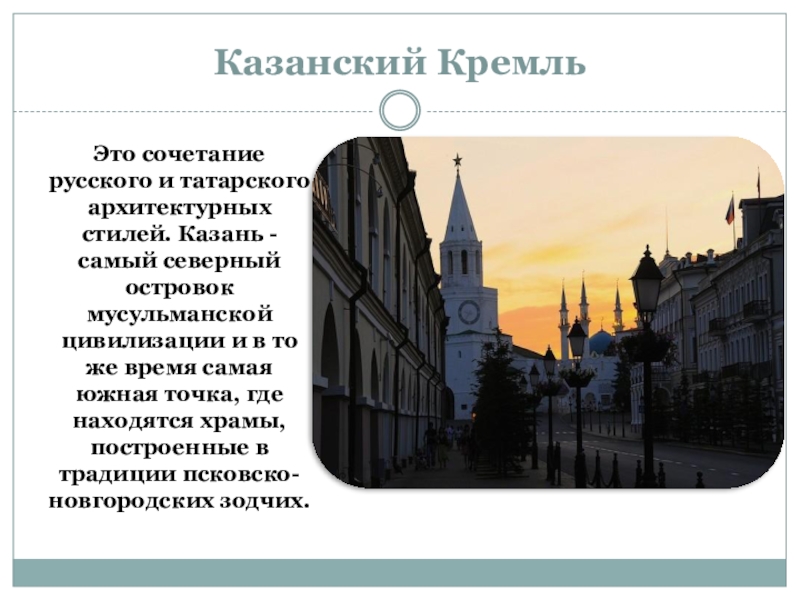 Это сочетание русского и татарского архитектурных стилей. Казань - самый