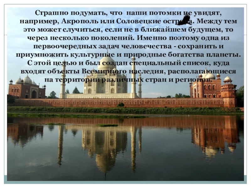 Слайд 2Страшно подумать, что наши потомки не увидят, например, Акрополь или Соловецкие
