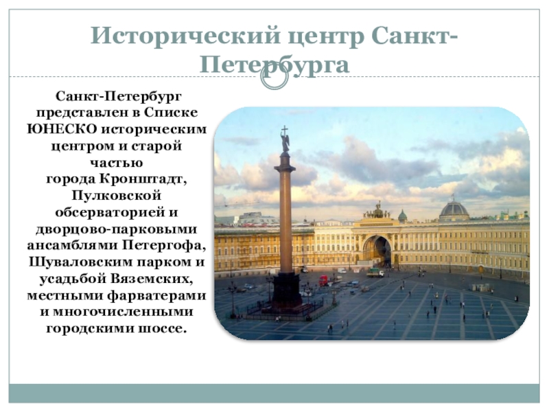 Санкт-Петербург представлен в Списке ЮНЕСКО историческим центром и старой